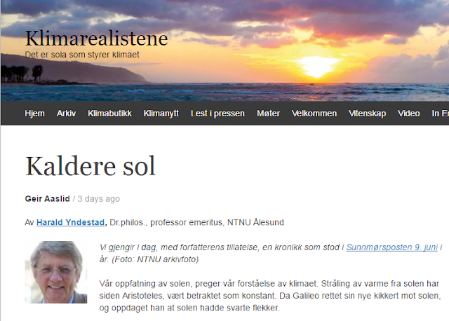 Her hjemme er det den kvasivitenskapelige konspirasjonsklikken Klimarealistene og Oljekrisa.no som er mest kjent for å systematisk feilinformere sine lesere om klima. Klimarealistene følger i fotsporene til kreasjonister og tankesmier i USA med sin pro-olje propaganda, sine konspirasjonsteorier og ideologisk/religiøse motiverte agenda. For dem betyr vitenskapen om klima lite eller ingenting. Klimakreasjonistene..unnskyld... realistene har etablert et gamlehjemsråd av pensjonerte oljelobbyister og cranks for å melke autoritetsargumentet til siste dråpe.Når de en sjelden gang får lagt bort partiprogrammet til FrP og bøkene til Ayn Rand kan det hende at noen av dem hoster ut noen fraser om at mer C02 er bra for oss. Eller at det er solen som styrer alt. Dette er litt avhengig av hvilken uke det er i fornekterland. En uke er det solen, den neste er det havet osv. Vi skal se nærmere på noen av disse oppblåste crankene.